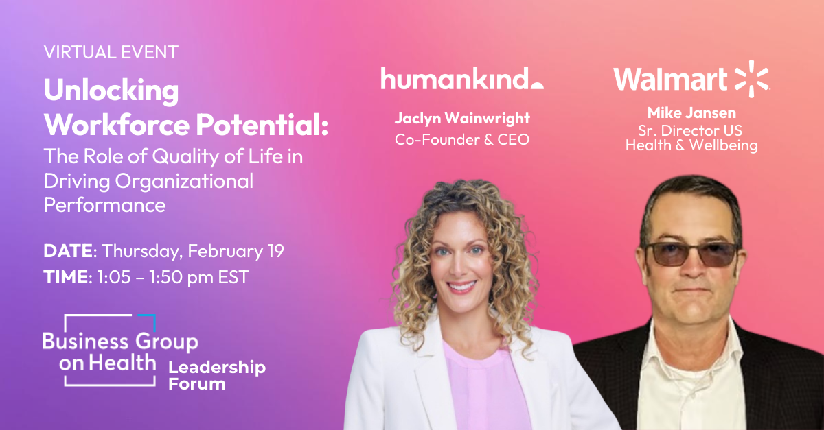 The Business Group on Health Leadership Forum on Employee Experience held its first-closed door meeting of the year, a virtual event featuring a presentation by Walmart’s Mike Jansen, Senior Director US Health & Wellbeing, and Jaclyn Wainwright, Humankind Co-founder & CEO, for a conversation about workforce stress, proactive outreach, and what becomes possible when employers measure Quality of Life — not just utilization.